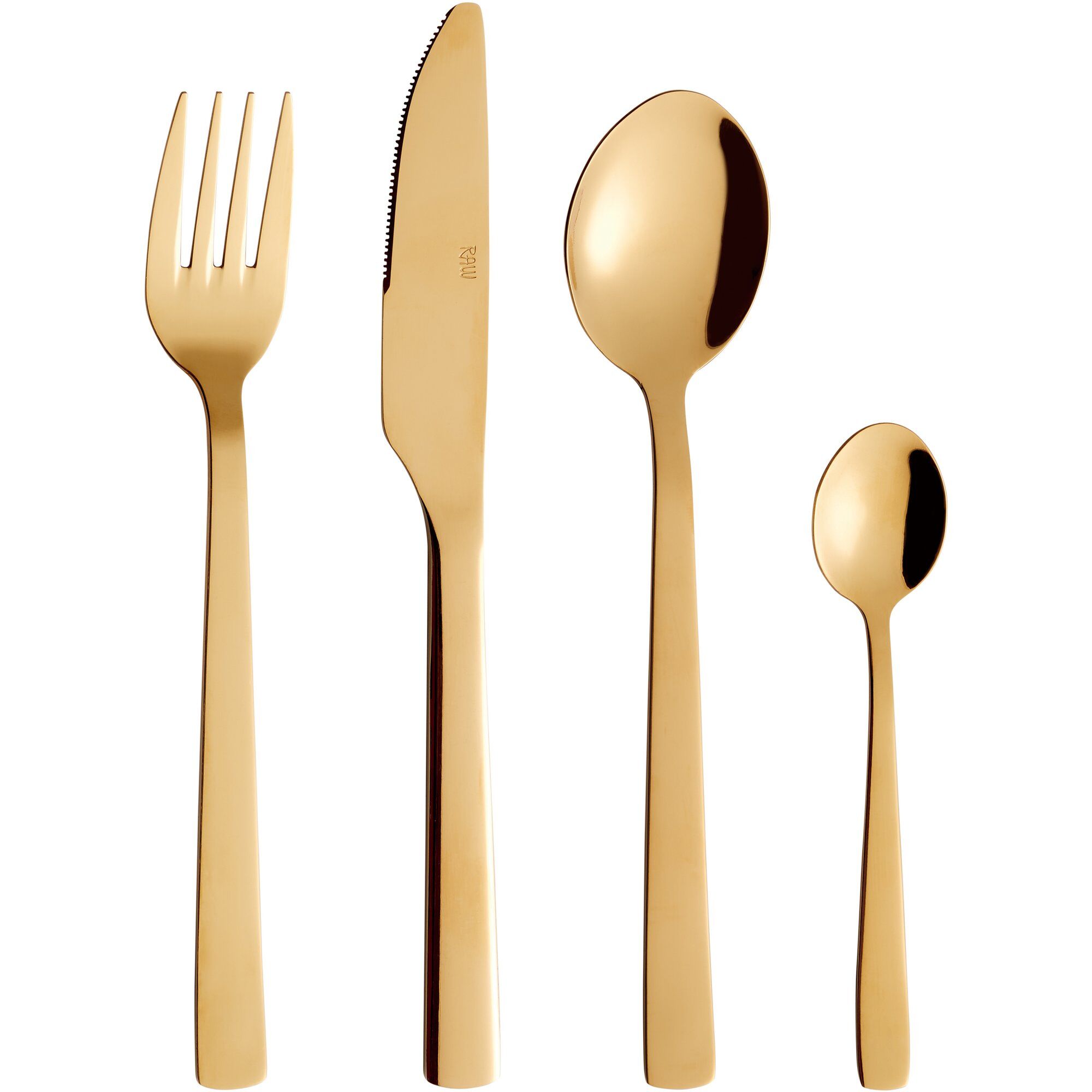 Smukt, guldfarvet bestiksæt i rustfrit stål fra danske Aida, der leveres i en fin gaveemballage. Bestiksættet er en del af RAW serien, der kendetegnes af dele med et råt og enkelt udtryk med et skandinavisk præg. Perfekt til en elegant borddækning b