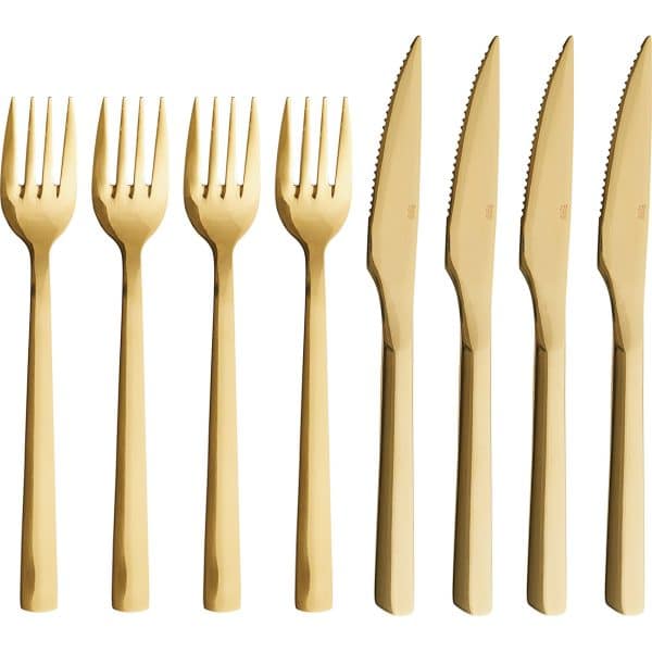 Flot sæt med grillbestik i guldfarvet, rustfrit stål fra danske Aida. Sættet består af otte dele: fire gafler og fire grillknive med takket æg. Grillbestikket er en del af RAW serien, kendetegnes ved sit stilrene design med skandinavisk præg. Perfekt ti